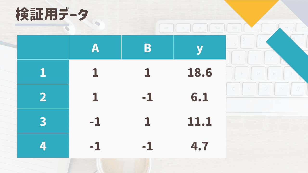 ここで\(y\)は応答、\(\beta_i\)は回帰係数、\(x_i\)は各因子の水準(1 or -1)です