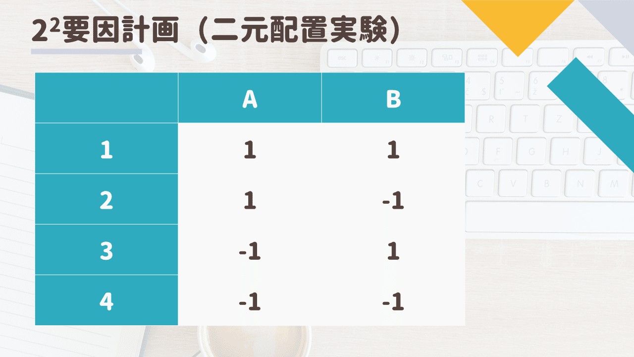 二元配置(\(2^2\)要因計画)の場合はこんな感じ