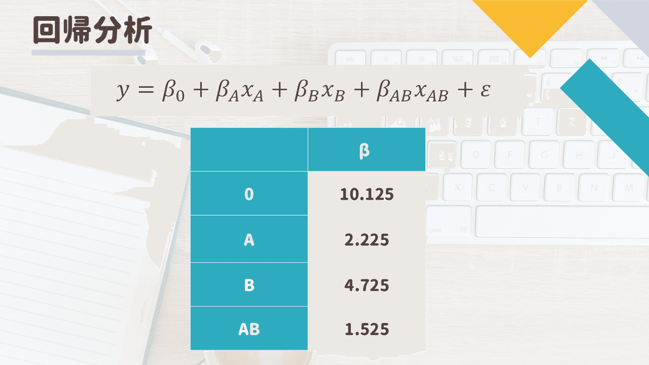 交互作用ABの係数は因子Aと因子Bの主効果の係数に対して小さいため