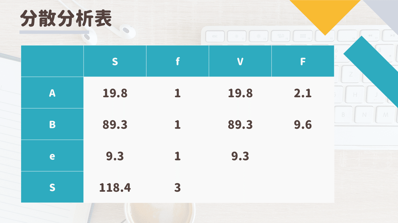 全自由度:3 = 因子A:1 + 因子B:1 + 誤差:1